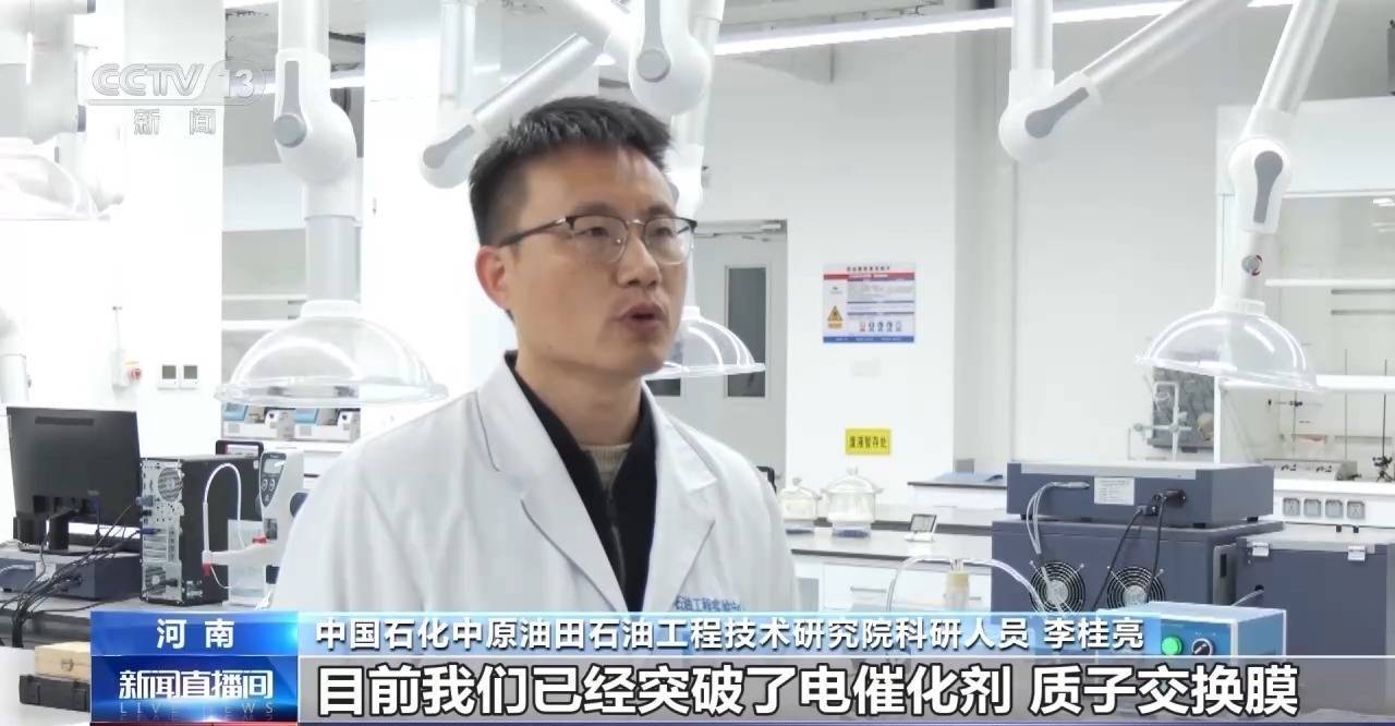 中国石化中原油田石油工程技术研究院科研人员 李桂亮:目前,我们已经突破了电催化剂、质子交换膜、膜电极、电解槽集成等电解水制氢的“卡脖子”技术与关键设备的全国产化制造,助力氢能产业向着规模化、效益化发展。