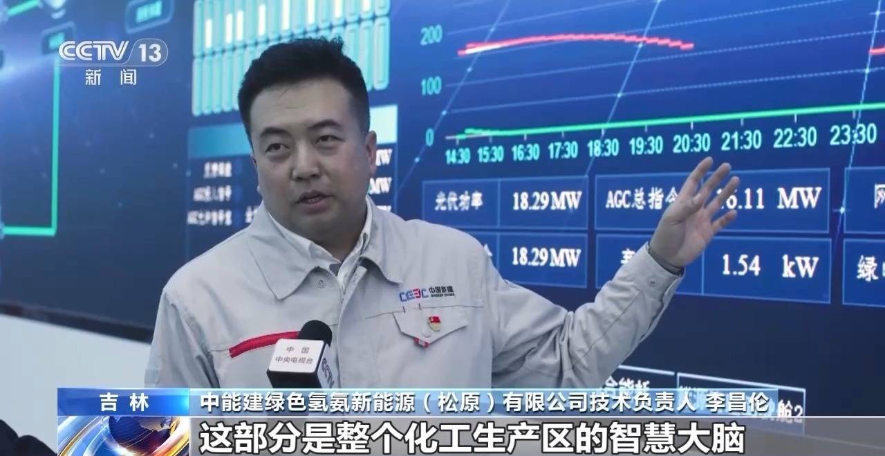 中能建绿色氢氨新能源(松原)有限公司技术负责人 李昌伦:这部分是整个化工生产区的智慧大脑,它的作用是根据风光新能源发电的功率预测,智能调整制氢还有化工生产的负荷,使其与风光发电的功率相匹配,最大限度地将新能源发电的电力转化为绿色绿氢,进而转化为绿氨,就是把新能源发电最大限度地消纳,实现产品转化。